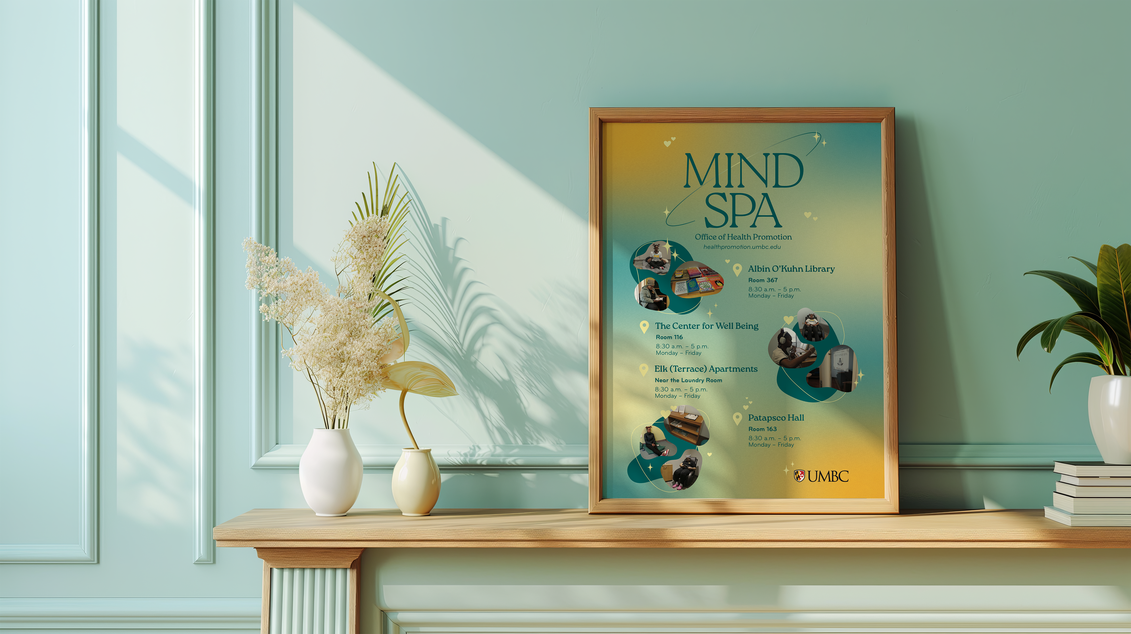 With this in mind, I wanted to design something that had a relaxing feeling while remaining remniscient of UMBC. I focused on a lesser known color in UMBC’s official color pallete: teal. Combining this teal with UMBC’s gold allowed me to pull in a spa-like aesthetic that still felt like part of the university.