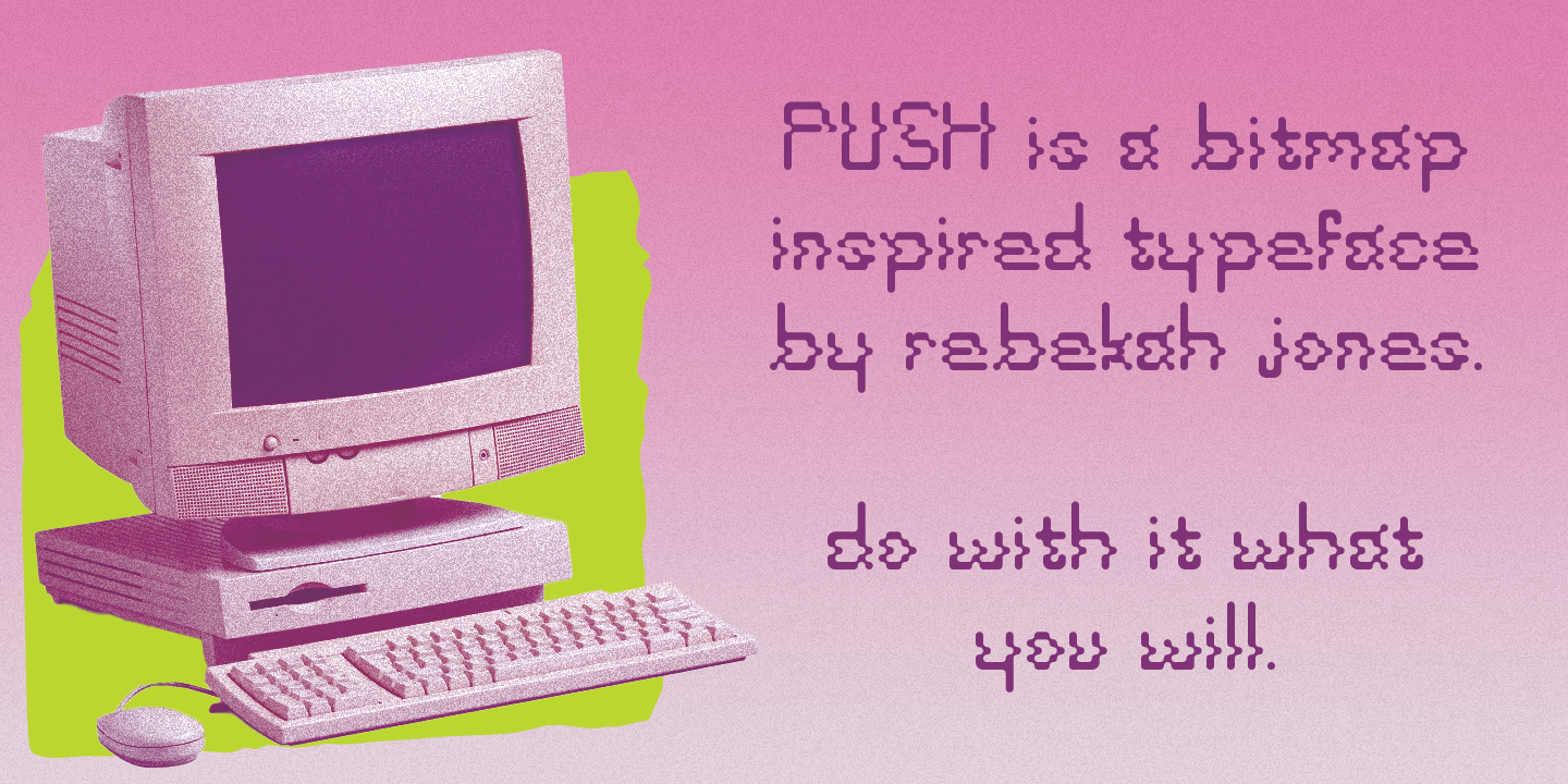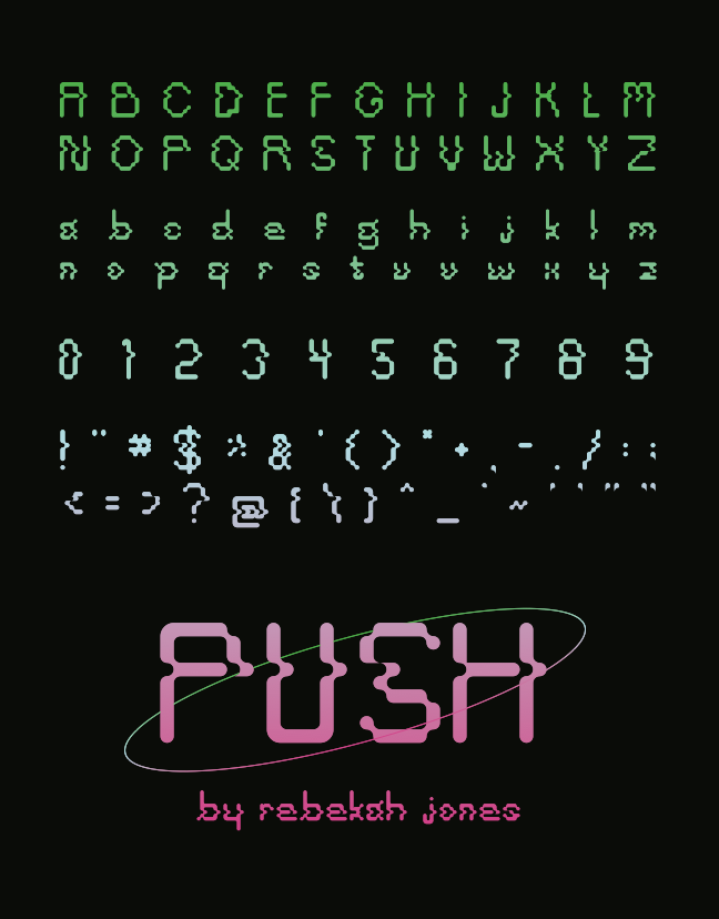 PUSH is a bitmap inspired typeface made in FontStruct. However, once the typeface is finished, a second challenge emerges: advertising it! Due to FontStructs block-based building interface, and the nostalgia inherent with bitmap, I decided to go for a look inspired by technology and toy advertisements in the late 90s/early 2000s.